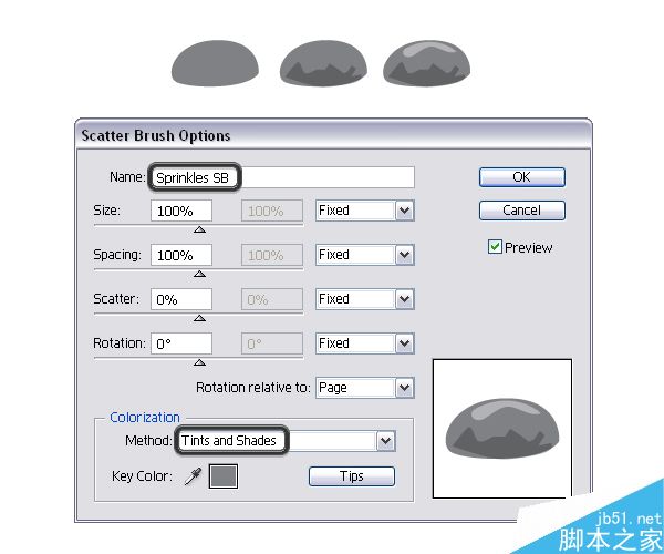 现在选择全部并拖拽至笔刷面板,然后选择新的散点画笔。 在散点画笔选项窗口中,别的设置不变,只要输入一个名字并改变色彩模式为浅色和暗色就可以。