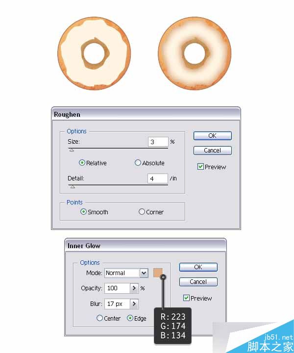 选择糖衣层,转到效果>扭曲和变换>粗糙边缘,应用下图所示的设置,并点击确定。 接着,转到效果>风格化>内发光,并用指定的设置应用这个效果。