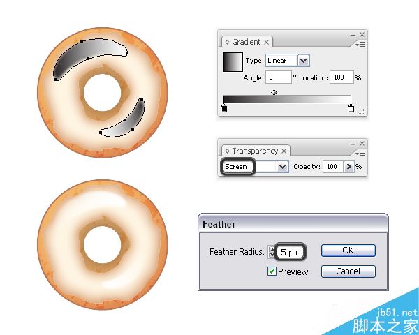 从巧克力糖果粒甜甜圈中制作2个高光形状的复本,并移动它们到新甜甜圈的相同的位置上。 都设置由黑到白的线性渐变,并使用渐变工具 (G) 调整角度。 设置它们的混合模式为滤色(黑色边透明)。 然后转到效果>风格化>羽化,并应用一个5px 半径。
