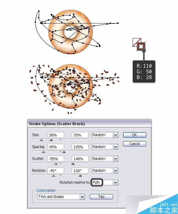 接下来,抓取钢笔工具(N)并画一条随机的路径到甜甜圈上,并用喷洒散点画笔。 选择棕色作为描边色,并双击外观面板上的画笔描边,为了改变设置。 这次,也设置旋转相对路径。