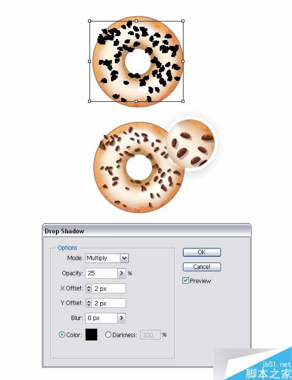 现在,删除巧克力片不需要的部分,而且也进入隔离模式(双击这个组其中一个巧克力片)。 在你完成后,选择新的巧克力组,转到效果>风格化>投影并应用下面的设置。 在这点上,糖衣巧克力片甜甜圈就完成了。