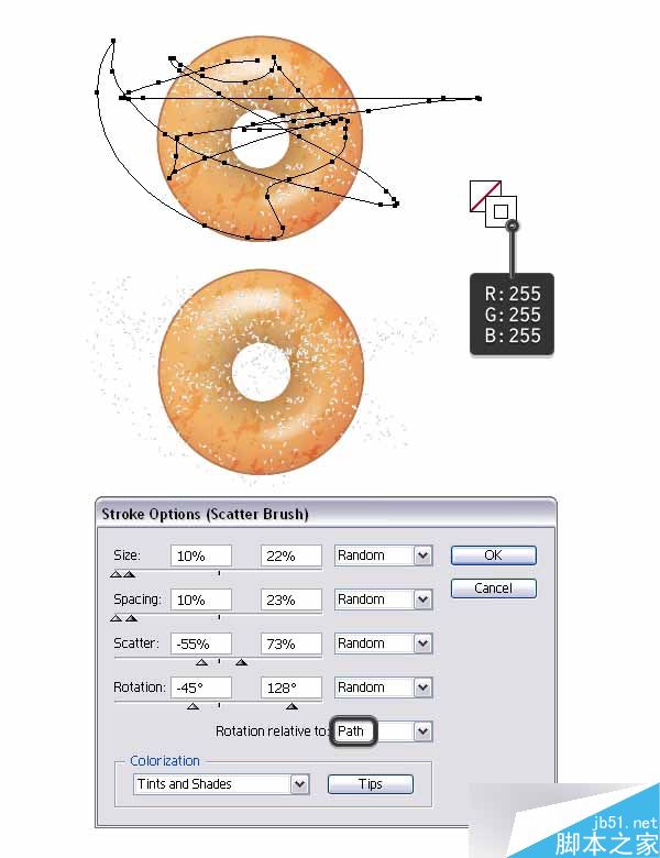 抓取铅笔工具(N)并在甜甜圈上画一条随机路径(我将之前的再一次使用了),并用喷洒散点画笔描边,但是这次设置颜色为白色。 从外观面板中打开描边选项窗口,改变设置来得到非常小的甜甜圈撒粉。 数量被选为随机。