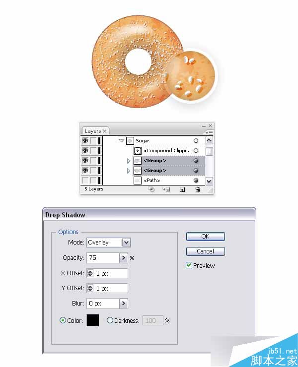 在图层面板,找到你各个建立和命名生成的编组为"Sugar"的遮罩层。 打开这个编组并选择2个描边路径,并转到对象>扩展外观。 现在进入隔离模式并从你使用的每个编组中删除2条路径,然后退出隔离模式。 接下来,转到效果>风格化>投影并应用2个编组中所示的的设置。 在此之后,白糖甜甜圈就完成了。