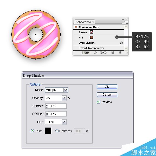 首先在"甜甜圈"下面制作一个新图层并将它命名为"阴影"。 现在在图层面板中找到你过去用于遮住"基本甜甜圈"的复合路径,复制并将它粘贴(Control-V)到新的图层中。 选择棕色作为填充色,然后转到效果>风格化>投影并应用下面所示的设置。