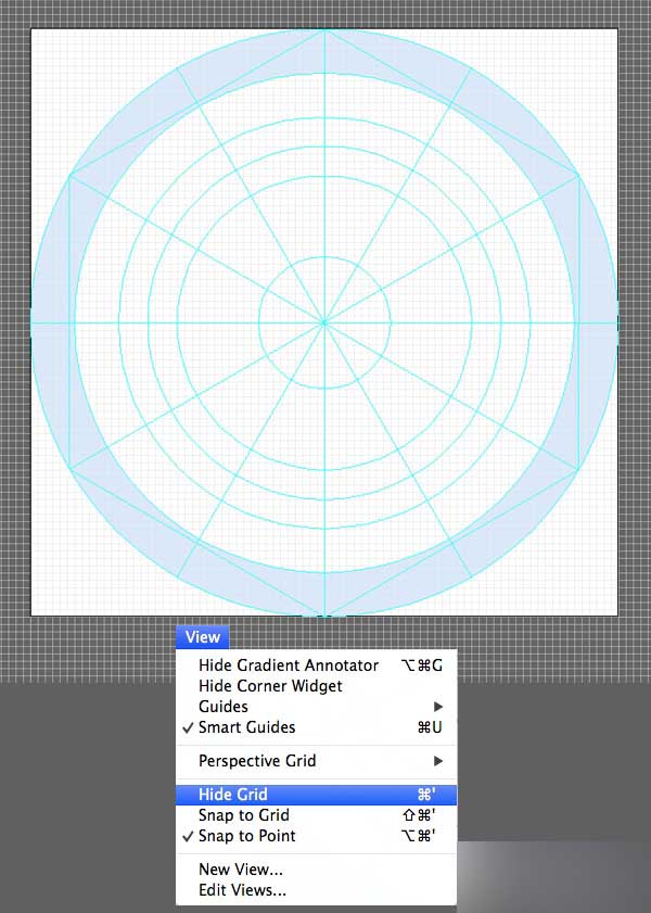首先打开其中一个图标模版(单击上面的链接即可下载。这个教程中,我们将使用80x80px的图标模版,适用于38mm 手表)。 转到视图>隐藏网格,使网格不可见,但是要确保智能参考线和对齐功能可见。