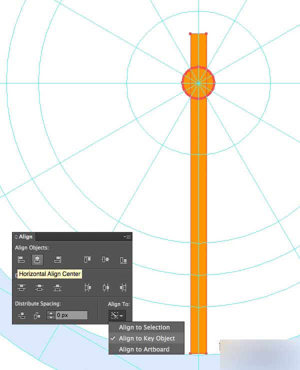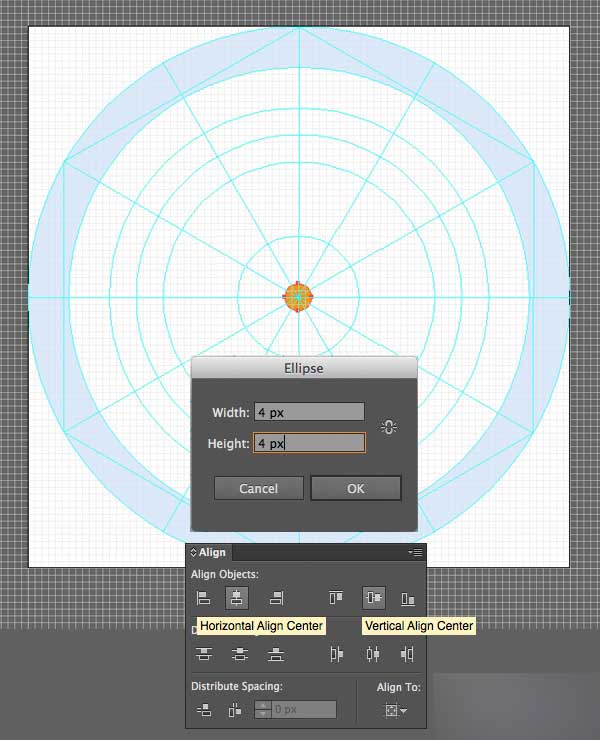 让我们创建我们第一个图标,创建一个4×4 px的圆。 双击椭圆工具(L)调用弹出的选项窗口,然后前往对齐面板,使圆在画板的水平和垂直放向上对齐。 用橙色(#FF9506)填充这个圆。