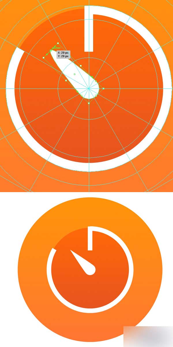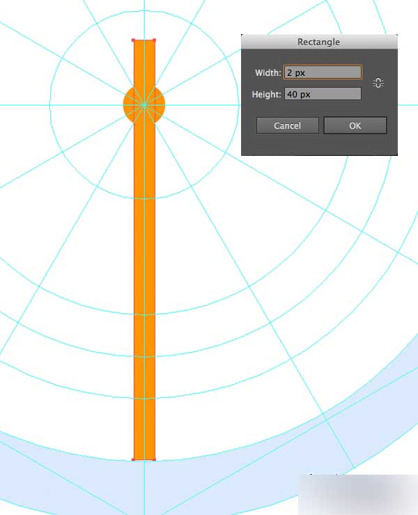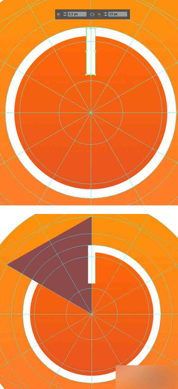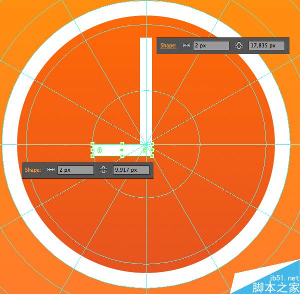 用矩形工具(M)创造一个2 x 40 px的矩形用作秒针。用相同的橙色填充,然后把它放中心参考线上,如截图显示的一样。