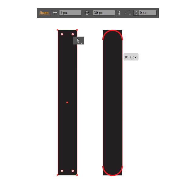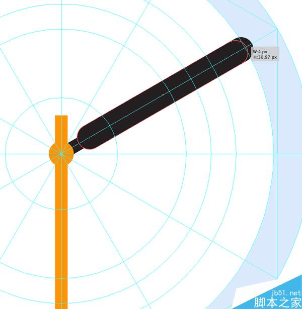 现在我们将绘制分针的身体。 制作一个黑色4 x 30 px的矩形,然后通过拉动小圆圈标记使尾端变圆,利用直接选择工具使他们最大化。(在我们这个例子中是2 px的圆角半径)。