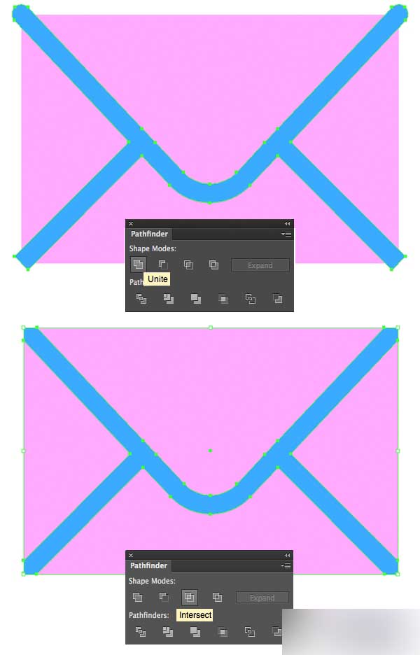 用橡皮擦工具(Shift-E)删除顶部较低的三角形,然后在路径查找器中合并这部分三角形。 最后,拷贝底子信封形状(Control-C > Control-F),选择矩形和顶部的形状,然后用路径查找器的交集功能切掉信封外面的部分。