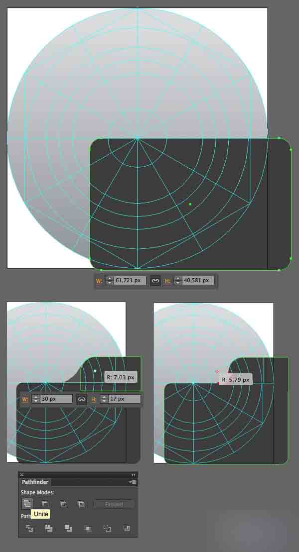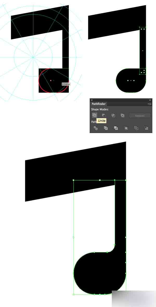 用直接选择工具选中下面方块的3个锚点然后使其角圆化。 然后在路径查找器中合并这些形状,并且利用活动角的特点使其变得圆润。