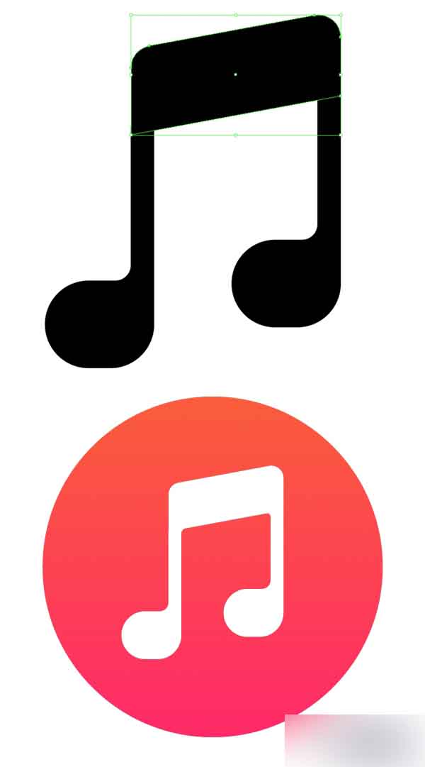 我们接下来的图标是音乐App,仅包含一个元素:一个音符标志。 首先创建一个27 x 11 px的矩形,用直接选择工具选中形状左边的锚点,然后向下拉使形状发生偏斜。