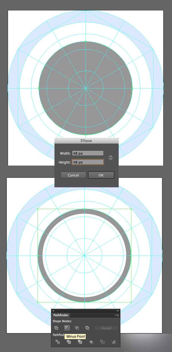 现在我们将转到一套与时间有关的图标。 首先创建一个48 x 48 px的圆,在里面创建一个小圆。 使用路径查找器中的减去顶层功能,创建一个圆环。