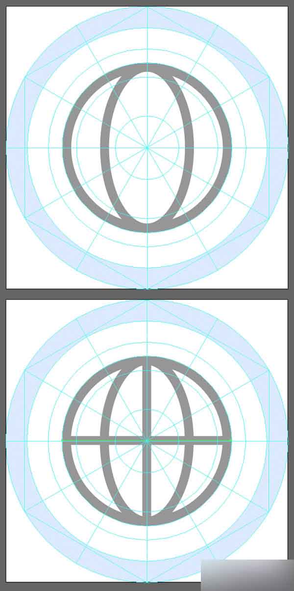 在第一个形状中创建一个更小的椭圆环并且添加2个交叉线,居中对齐。