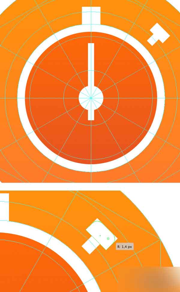 利用矩形工具 (M)在我们的秒表的顶部添加次要的细节。 为了使秒表的底部更圆滑,利用活动角并且设置角半径为1.4px。