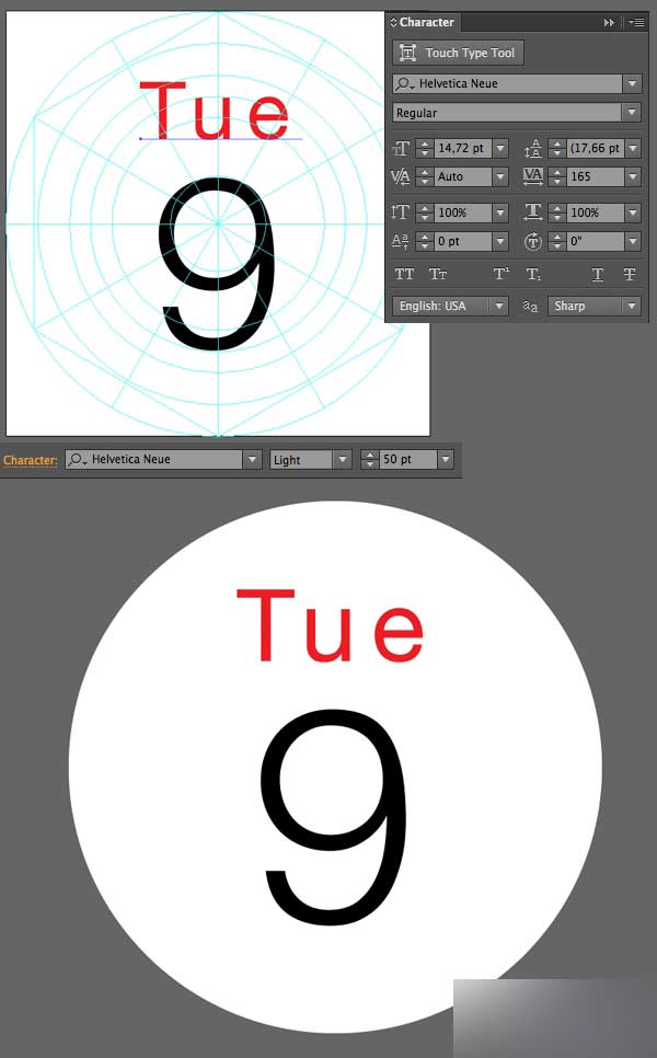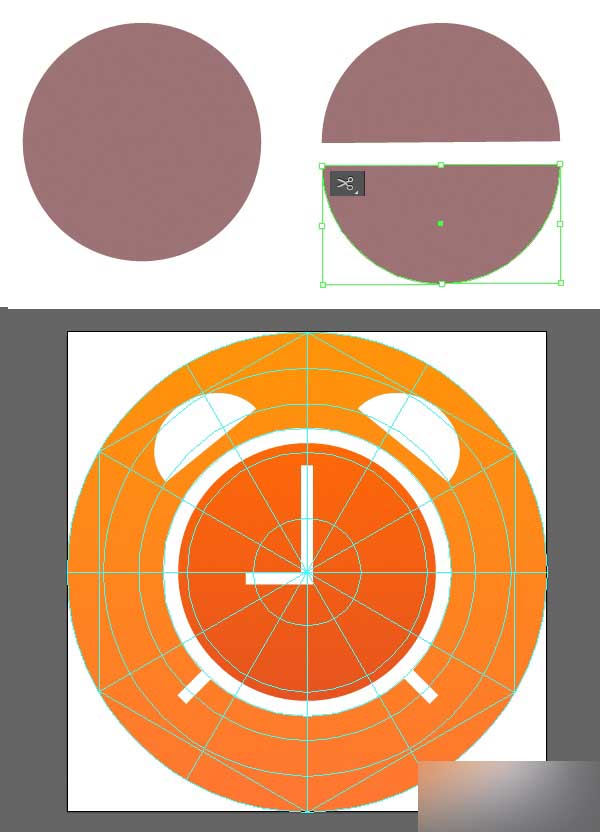让我们利用椭圆工具(L)制作的圆来绘制一个闹钟的上部分,用剪刀工具(C)点击侧锚点的方法,把圆形划分为2个相等的部分。 在闹钟底部放置半圆,然后添加两个小"腿"在底部,完成这个图标。