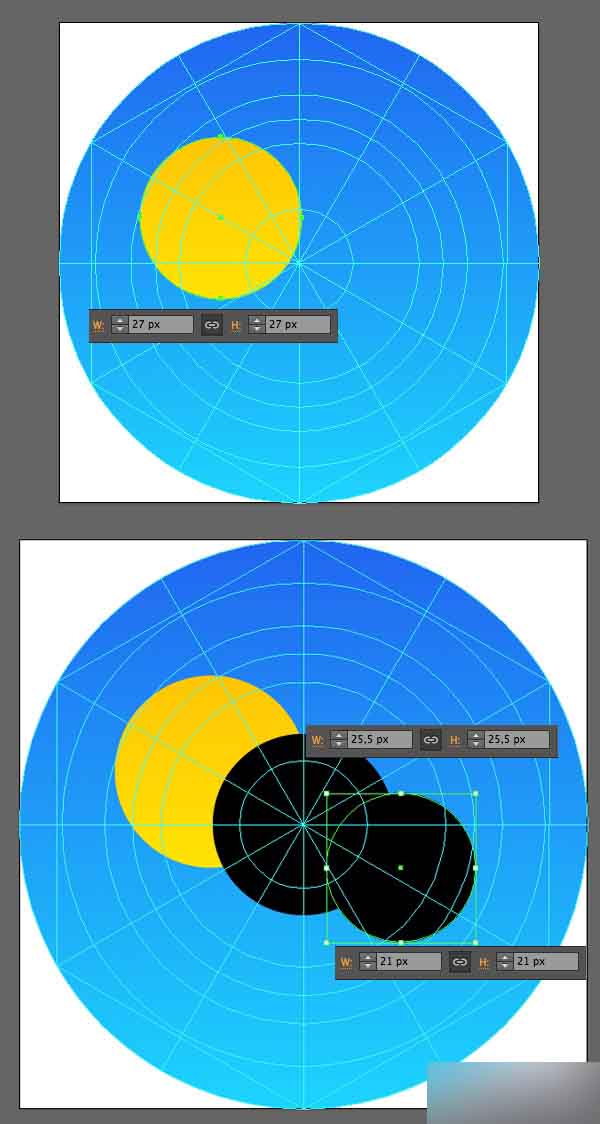 在图标的左边部分添加一个黄色(线性渐变从#ffc505到#fee403)的圆作为太阳。 用两个圆形成云:一个25.5 x 25.5 px 的圆在模版中心,和一个21 x 21 px 的圆在这个图标的右边部分。