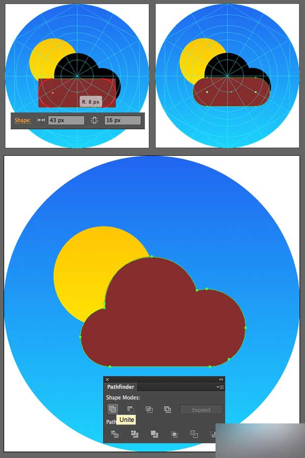 创建一个43 x 16 px矩形并且使其角有8 px角半径的圆润。 对齐这个矩形和圆形,然后在路径查找器中合并3个形状,形成一个光滑圆润的云。