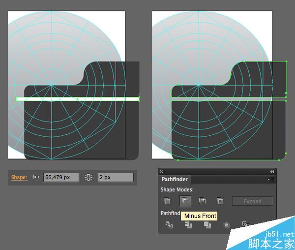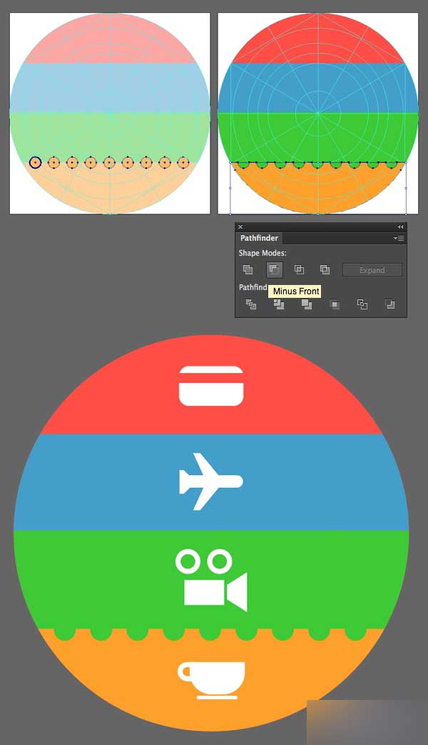 再次选择矩形和条纹,然后应用路径查找器的减去顶层功能切除这些线。