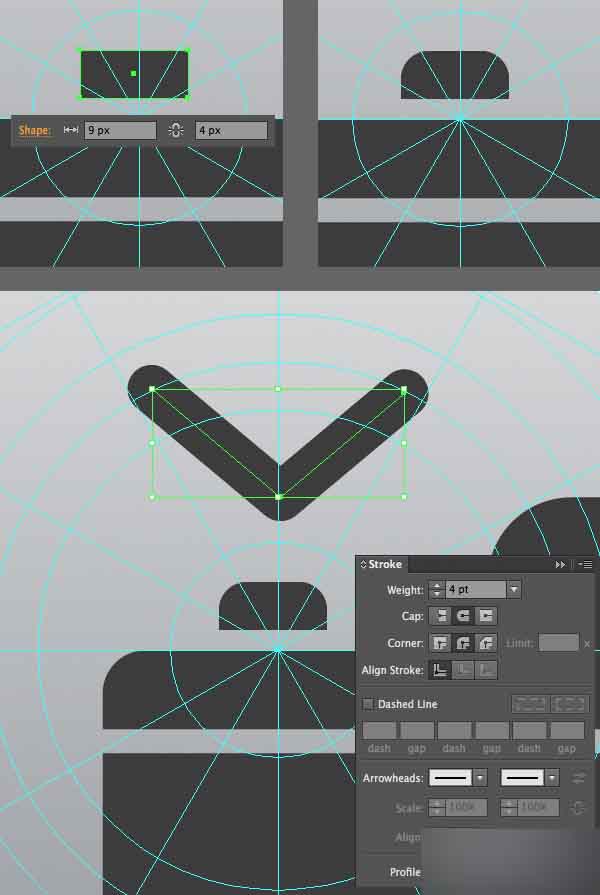 用9 x 4 px的矩形创建快门图标,然后放在我们模版的中央。 用钢笔工具添加一个箭头来指向快门,设置描边宽度为4 pt,然后在描边面板中使端点和边角圆滑。