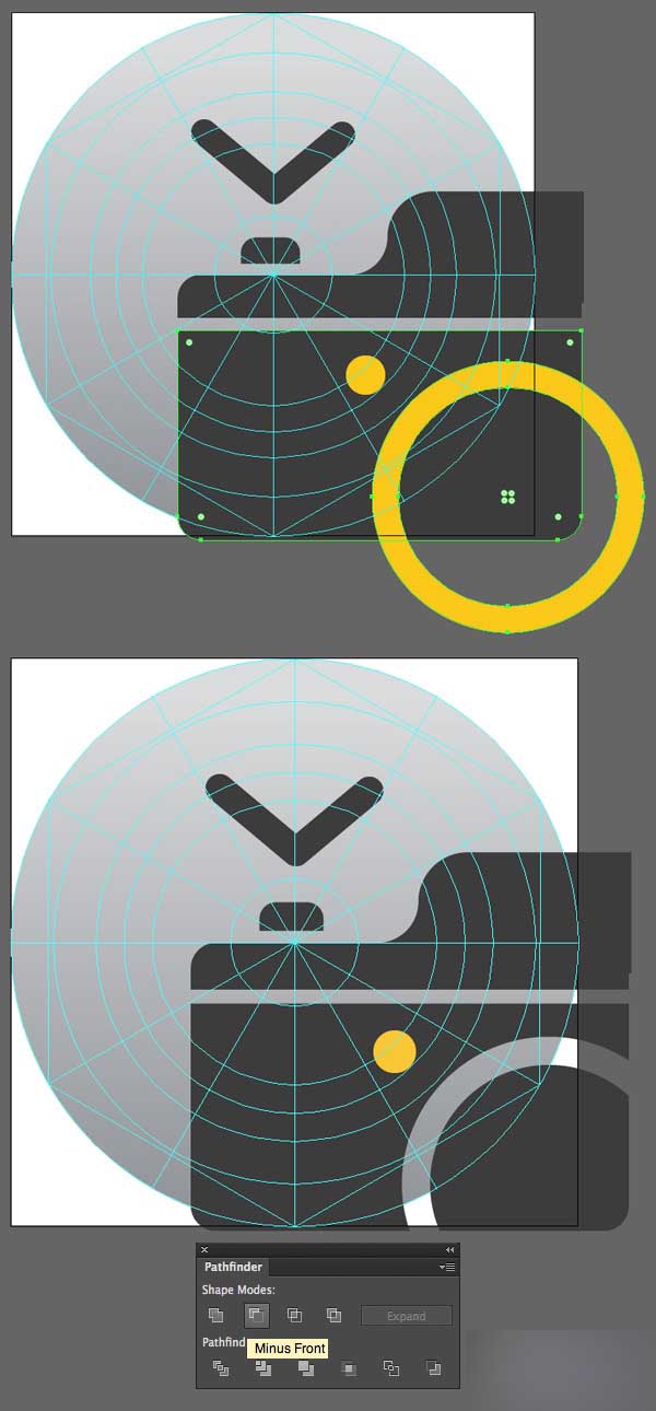 对象>扩展这个大圆,转换它为圆环。 选中圆环和照相机,然后应用减去顶层减去圆环,形成对象-玻璃。 选择相机深灰色的部分并且按下 Control-8转变它们为单独组合形状。