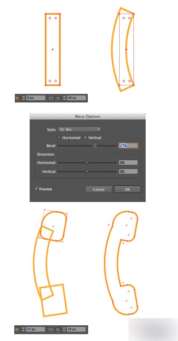 让我们为电话图标制作一个话筒。 创建一个8 x 40 px的矩形,然后到效果>扭曲>弧,选择27%的垂直弯曲值,弯曲矩形的左边。 在顶部和底部的话筒添加2个17 x 20 px的矩形,然后使它们的角圆润,使形状光滑。 在路径查找器中合并全部话筒的部分。