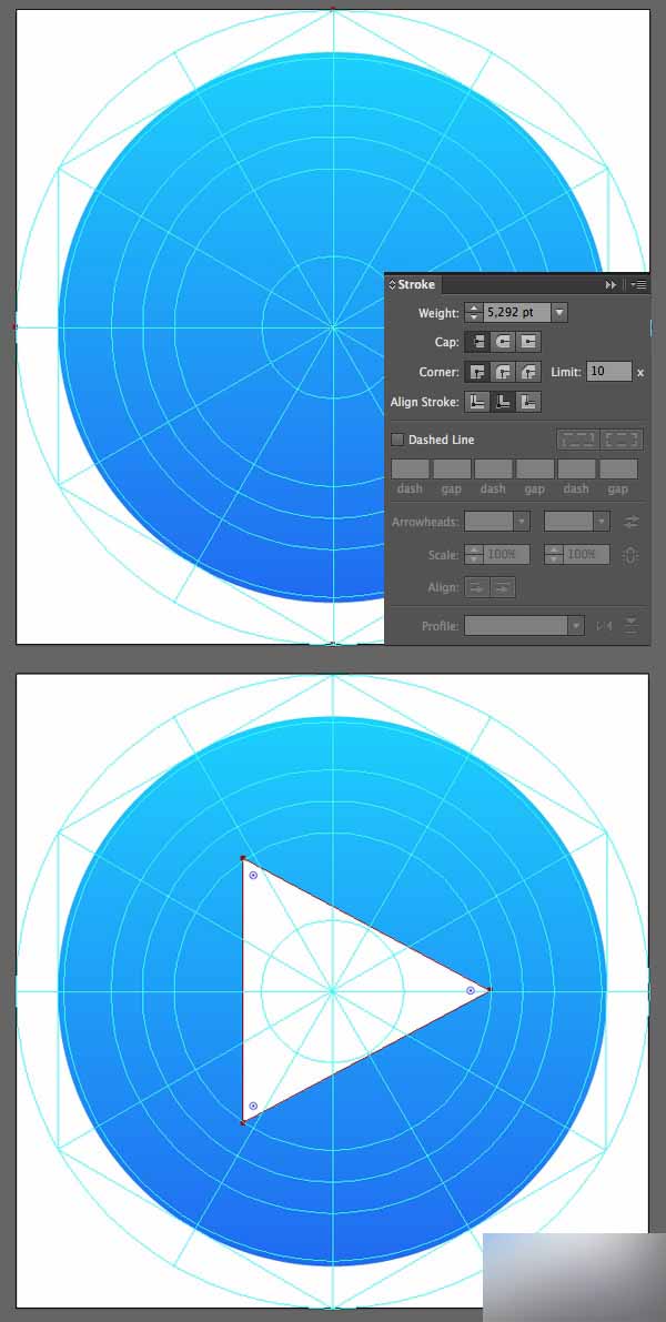 首先,形成一个渐变的底子(从深蓝色#2066f0的底部到浅蓝色#1dd4fd的顶部)。 添加5.3pt宽的白色描边,然后从内部对齐。 在我们的图标的中心放置一个30 x 30 px白色三角形。