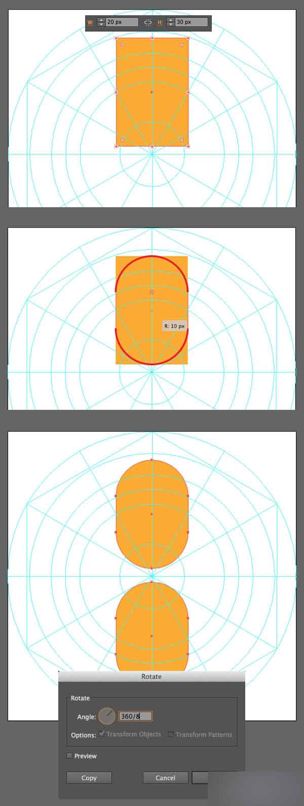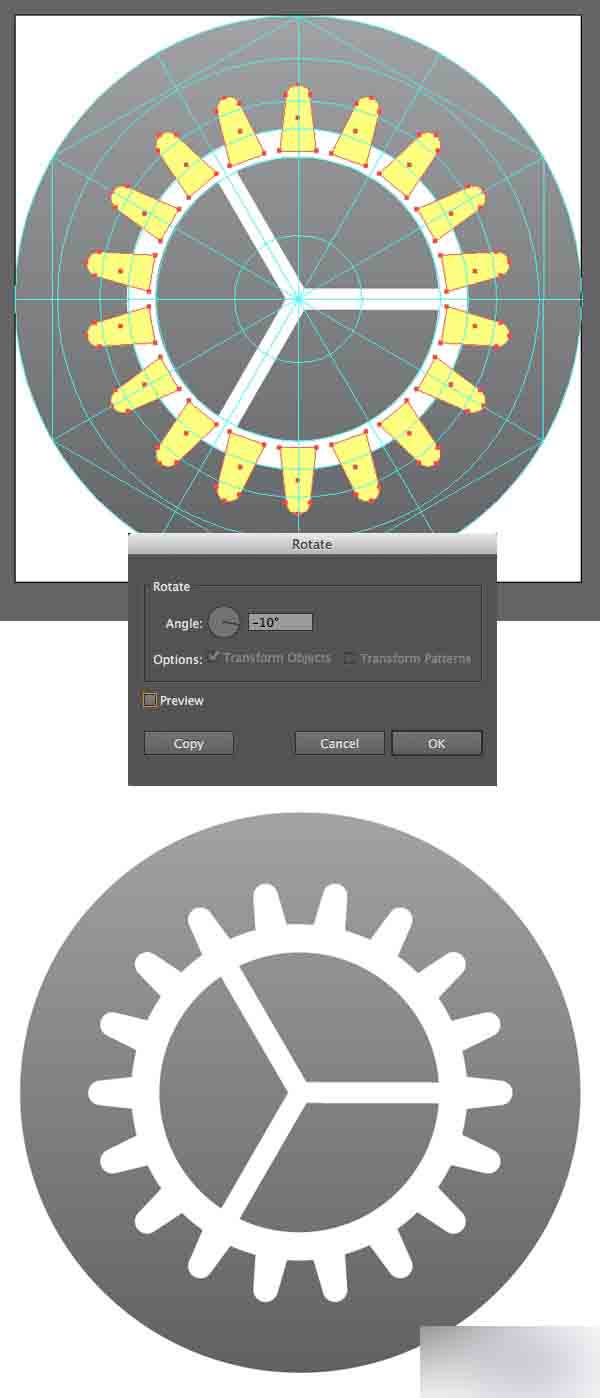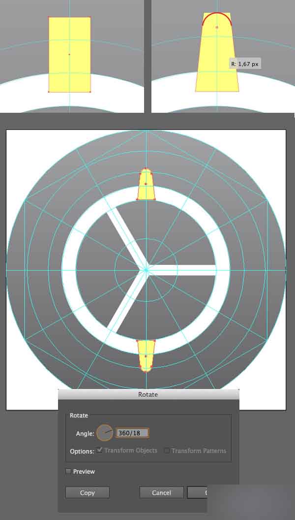 用旋转工具(R)选中全部波纹,双击旋转工具(R)调用弹出选项窗口,然后设置旋转值为360/18。 这种方式, Adobe Illustrator将会自动计算出18个形状的合适值。 按下拷贝按钮。