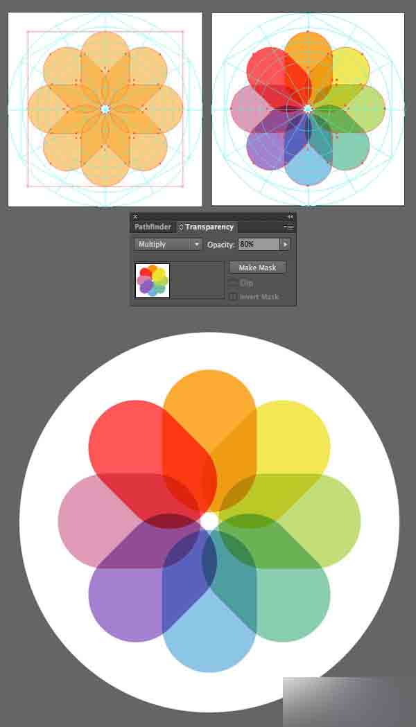 按下 Control-D数次形成八瓣花。 转换花瓣为正片叠底混合模式且降低透明度到80%。 让我们应用喜爱的颜色到每片花瓣,从中间最上的开始顺时针移动:橙色 (#fa9700),黄色(#f0e22c),绿色(#b5d558),绿松石色 (#6ec19d),蓝色(#71b5e1),紫罗兰色(#8f60c3),粉色 (#d782a4)和红色(#ff2c2c)。