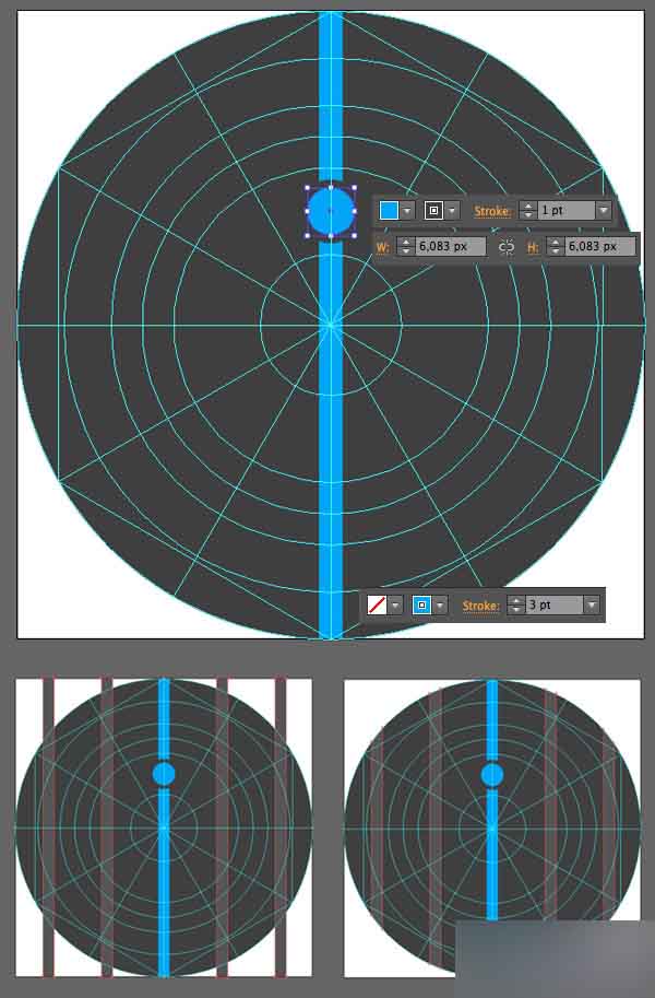 添加一个蓝色的小圆圈并且应用一个深灰色(#3f3f3f) 1pt 的描边,为了使它在视觉上分隔开来。 添加另外4条线在这个图标的两边,用浅灰色(#555555)的3pt 描边 。
