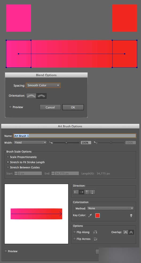 你可以在对象>混合>混合选项编辑这个设置,应用顺滑颜色制作一个漂亮的无缝混合。 拖动创建的混合组到笔刷面板,然后创建一个新的默认设置的艺术画笔。