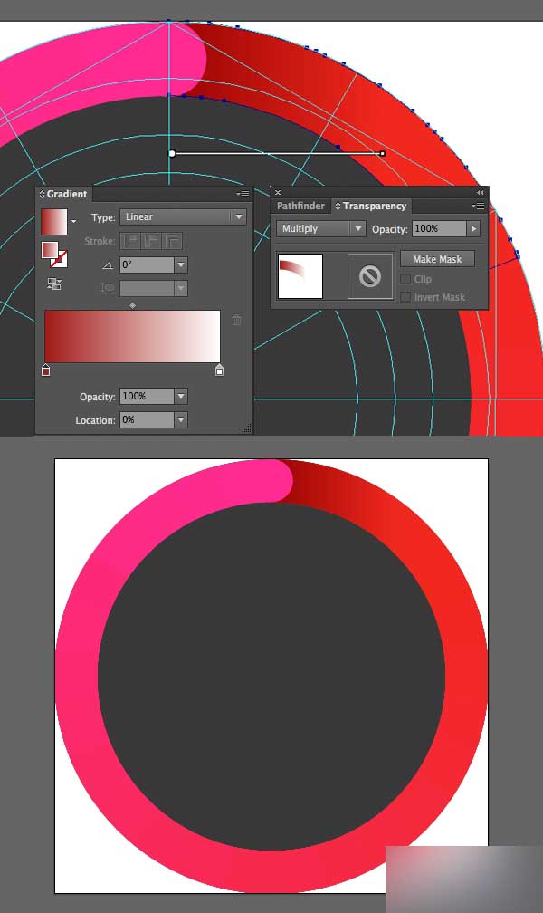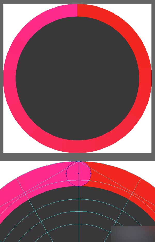 创建一个粉红色 (#ff2b91)的小圆环,放在彩色圆环中间顶部的区域,使它符合形状的高度,用来隐藏两个颜色之间的联系。
