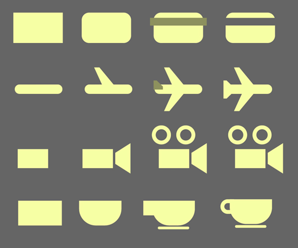 接下来是存折图标,包含4个小小的象形图:一个信用卡,一个飞机,一个摄像机和一个咖啡杯。 这些象形图都是简约的,并且都由基本的形状在路径查找器和活动角特征的帮助下制成的。 你可以从下面一步步的截图看到每个象形图标是怎样连接而成的。