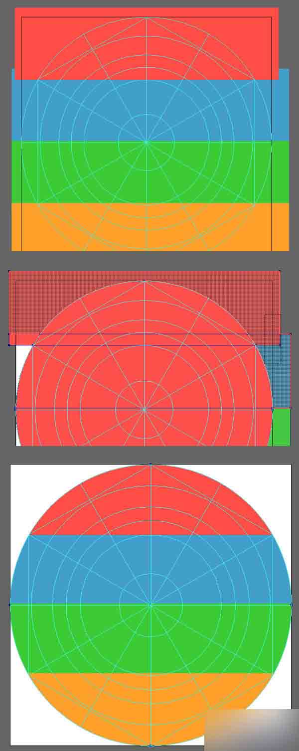 这个图标的底子由4个不同颜色的条纹构成:红色(#ff4e46),蓝色 (#439eca),绿色 (#3dca36)和橙色(#ffa02b),每个高度都是 20 px。 在形状生成器工具(Shift-M)的帮助下创建一个默认的80×80px 图标的圆形底子,通过选择所有对象,同时按住Alt键,然后单击不需要的部分,删除不需要的条纹。