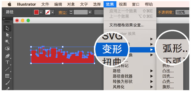 再到上方工具栏找到"效果 > 变形 > 弧形"(如下图)使房子做适当变形,令场景更有动感。