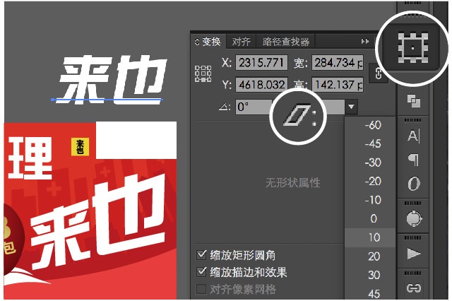 通过右侧工具栏中的"变换",使文字稍微倾斜,并在画面中分别调整两字角度、大小、比例。