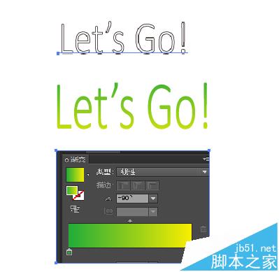 3、将上面文字改为渐变色。方法:选择文字-图形样式-默认图形样式,文字变为空心字,然后选择右边面板中渐变,调整渐变色,点击渐变色给文字上色,并调整角度。渐变文字就做好了。如果文字有描边,请在粗细中将数字改为0。