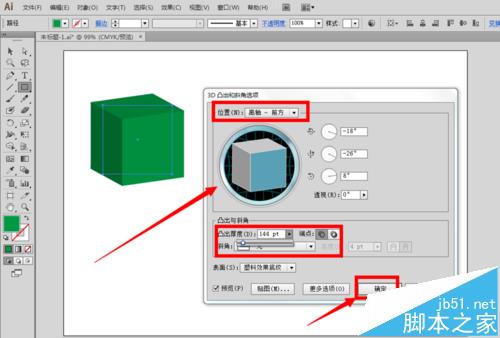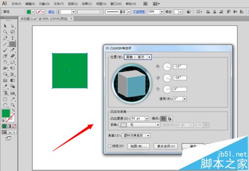 5、勾选预览效果,根据自己的需要,修改凸出的位置、角度、厚度、斜角等等这些,然后就点击确定按钮。这样就可以得到了一个具有立体效果的正方形了。
