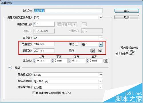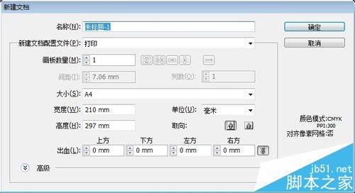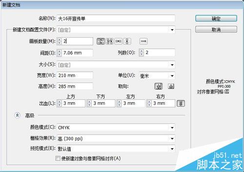 6、出血的设置,印刷品一般都需要设置出血,出血的行业默认数值3mm,例如你做个210x285的大16开的单页,画板尺寸设置为210x285,出血上下左右各3mm,这样就是成品210x285带出血尺寸216x291。