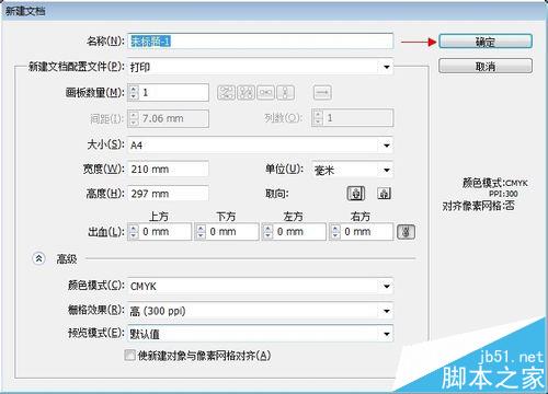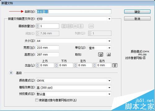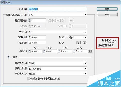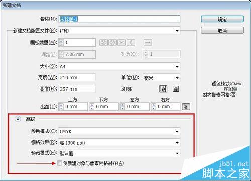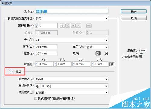 7、高级设置,第一条颜色模式,做印刷的东西颜色模式一定要用cmyk,具体原因百度一下,第二条删格效果,此项默认设置即可,第三个也是默认值即可