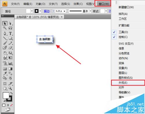 2、选中需要去除阴影的图形,点击菜单栏中的“窗口”选择“外观”调出外观面板,操作如下图