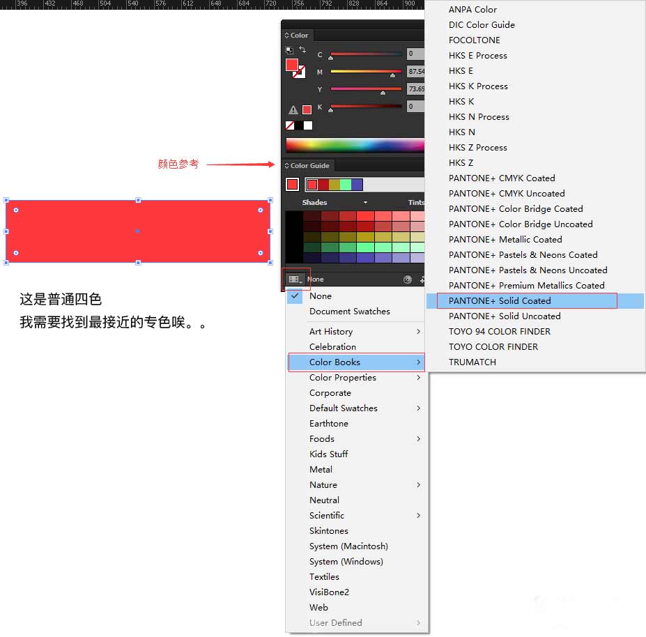 第二步,建立色板后,切换到"颜色参考"面板,点击面板下方图标,出现下拉菜单,然后点击"色标簿"\ PANTONE+ Solid Coated(这里可选择自己需要查找的色卡类型)