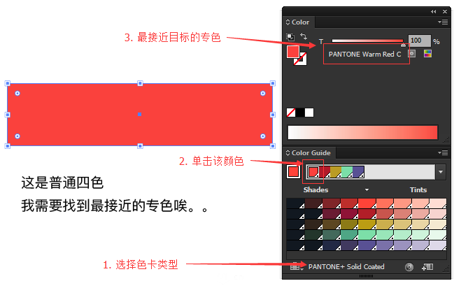 第三步,色卡类型选好后,单击"颜色参考"面板推荐的颜色,然后切换到"颜色"面板,最接近目标的专色号就呈现在你的面前。