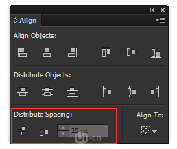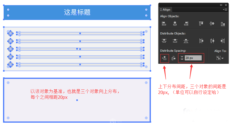 上面两行分别是"对齐对象"和"分布对象",大家肯定不陌生,而下面的"分布间距"是根据具体参数来分布多个对象的,例子在下面。
