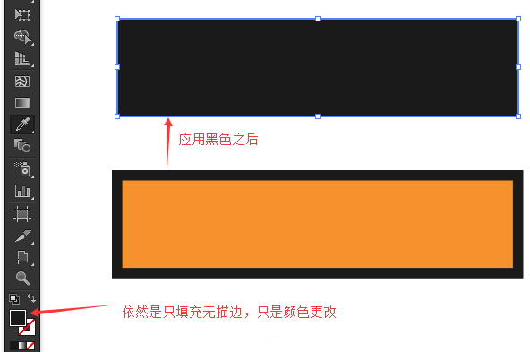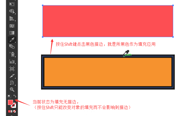 关于吸管工具的用法,这里只介绍它与快捷键组合后的功能。 与Shift键组合:仅提取目标颜色并应用到当前属性,以下图为例,红色矩形提取黑色来填充而不影响描边。