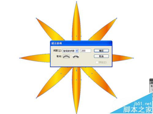 8、选择该图形,双击工具箱里混合工具,弹出混合选项对话框设置间距为指定的步数为200,点击确定。