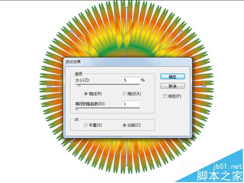 10、反复执行执行ctrl+d组合键进行关联复制,直至形成一个圆形为止。执行效果-扭曲和变换-波纹效果命令,设置大小为10,勾选相对,每段的隆起为1,点击确定。