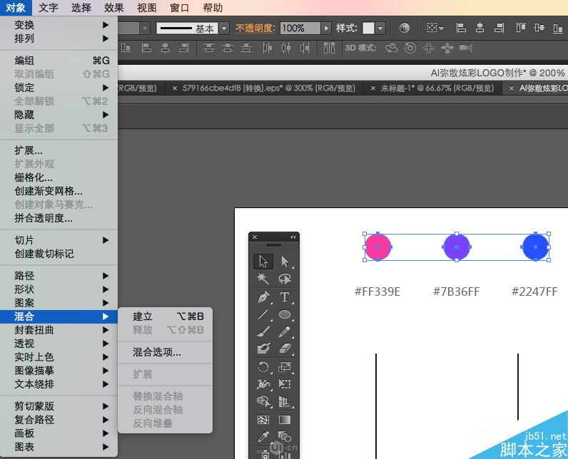4、框选前3个圆,然后在菜单-对象-混合-建立。