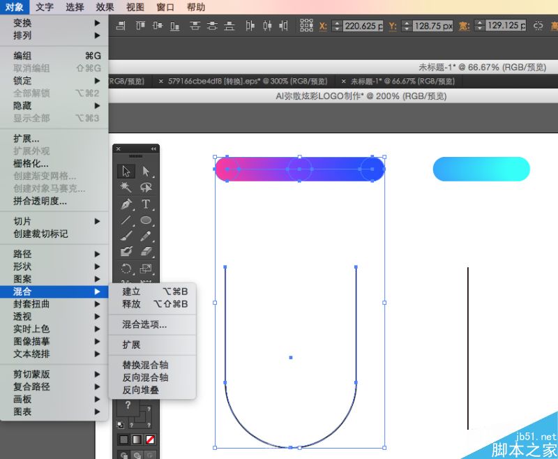 6、选中第一个生成的渐变条和U这个图形。然后,菜单-对象-混合-替换混合轴。