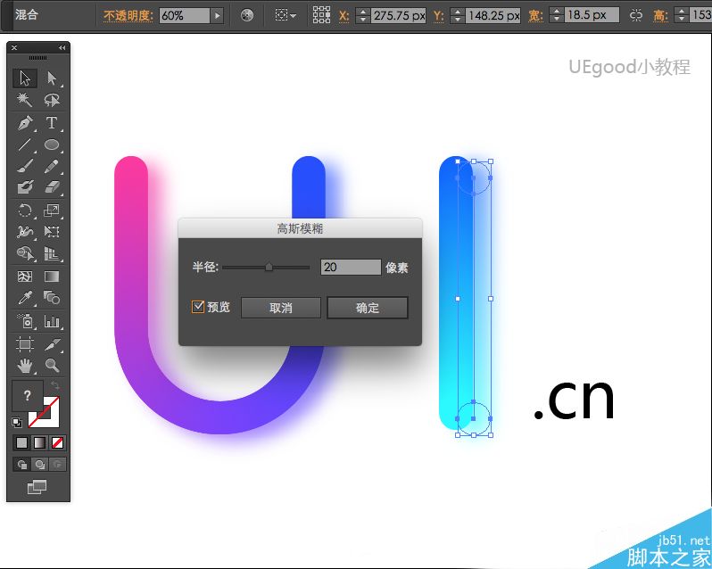 8、在图层面板里复制一个U的渐变图形。把透明度改为60%,然后,菜单-效果-模糊-高斯模糊,半径为20像素。