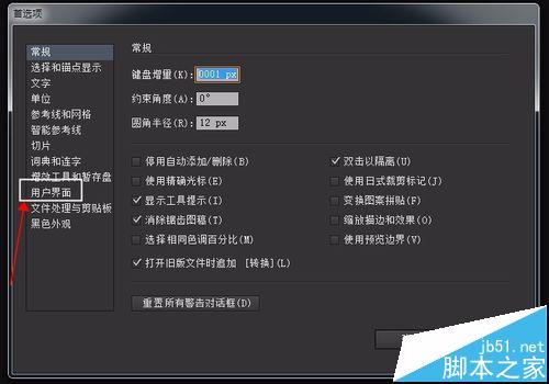 3、我们按下Ctrl+K键,注意这是在英文的输入方式下操作的。选择最左侧,下面有个“用户界面”,如图中画红色箭头的地方就是。